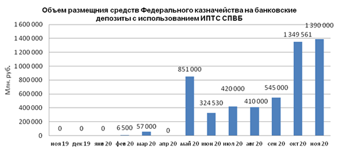 В ноябре 2020 г. объем размещения средств федерального бюджета на банковские депозиты, осуществленного Федеральным казначейством с использованием информационных программно-технических средств СПВБ, составил 1 390,000 млрд. руб. и незначительно вырос по сравнению с объемом размещения в октябре 2020 года - 1 349,561 млрд. руб.